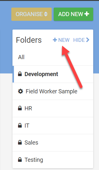Click the NEW FOLDER link found in any of the Screens, Docs or Data Sources pages.